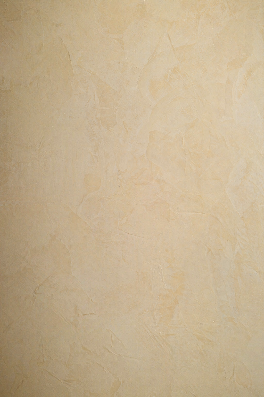 Stucafwerking met minuscule glaspareltjes die zorgen voor een unieke lichtweerkaatsing. Door de lichtinval en reflectie krijgt het kleurvlak extra diepte.